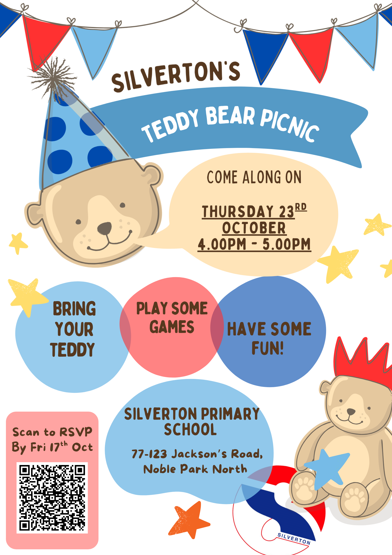 We’re excited to invite 3 and 4-year-old kinder children to join us for a fun Teddy Bears Picnic at Silverton Primary School! Date: Thursday, 23rd October Time: 4:00 – 5:00 pm